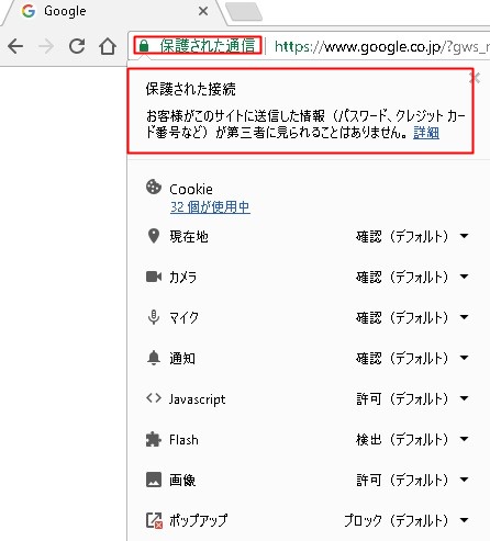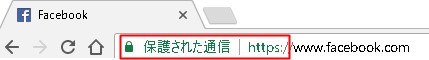 鍵のマークの右側に「保護された通信」と書いてあり